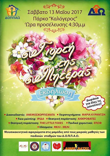 Ο Δ.Ο.Π.Π.Α.Ω. σας προσκαλεί το Σάββατο 13 Μαϊου στο πάρκο "ΚΑΛΟΓΗΡΟΣ" στις 4:30 μ.μ. σ' ένα μεγάλο πάρτυ αφιερωμένο από τα παιδιά σε όλες τις μανούλες. Διασκεδαστές, θεατρικά, χορευτικά, χειροποίητα δωράκια και λουλούδια για όλες τις μητέρες και υπέροχα εδέσματα για όλους. Τα μικρά μας του κάθε παιδικού του Δ.Ο.Π.Π.Α.Ω. θα πραγματοποιήσουν ειδικό αφιέρωμα στις μανούλες τους. Σας περιμένουμε όλους να τιμήσουμε την "ΓΙΟΡΤΗ ΤΗΣ ΜΗΤΕΡΑΣ"